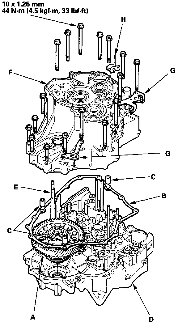 9. Install the transmission housing (F) with the transmission hangers (G) and harness clamp bracket (H), then tighten the bolts.