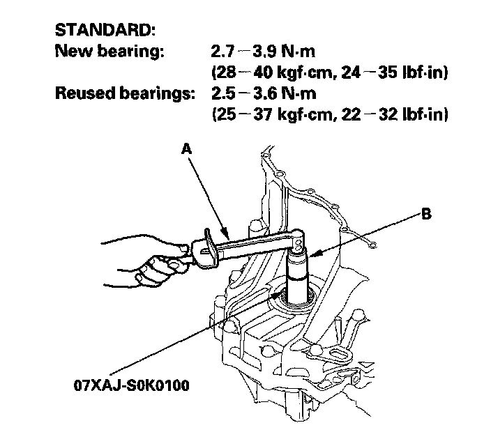 11. Measure the starting torque of the differential assembly with the special tool, a torque wrench (A), and a socket (B). Measure the starting torque at normal room temperature in both directions.