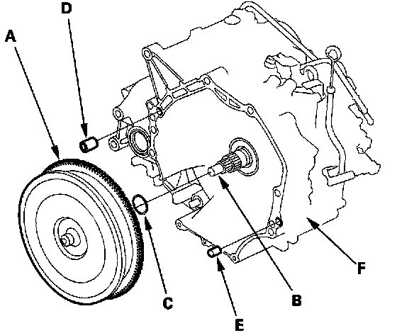4. Install the 14 mm dowel pin (D) and 10 mm dowel pin (E) in the torque converter housing (F).