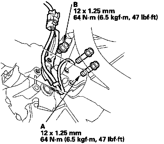 6. Attach the transmission to the engine, then install the transmission housing mounting bolts (A) and connector bracket bolt (B).