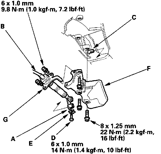 15. Install the shift cable cover (F), then install the shift cable holder (G) on the shift cable cover.