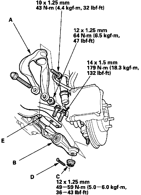 24. Install the radius rods (E) on each lower arm.