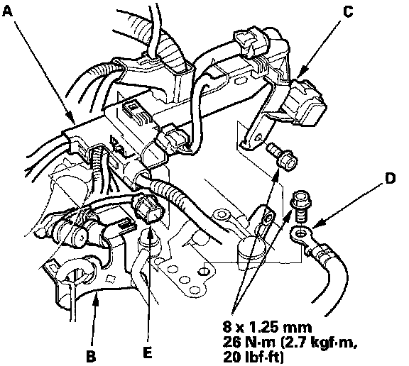 32. Install the harness cover (A) on the transmission hanger (B), then install the connector bracket (C) and the transmission ground cable terminal (D).