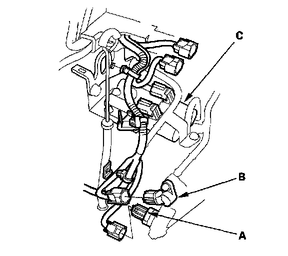 34. Connect the connectors to the 3rd clutch pressure switch (A), mainshaft speed sensor (B), and A/T clutch pressure control solenoid valves A and B (C), then install the clamps on the clamp brackets. Do not allow water, fluid, oil, dust, or other foreign particles to enter the 3rd clutch pressure switch connector.
