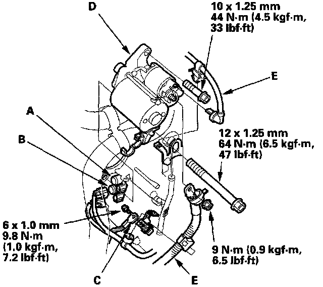 22. Connect the vacuum tube (E), and install the power steering fluid pipes (F) on its clamps.
