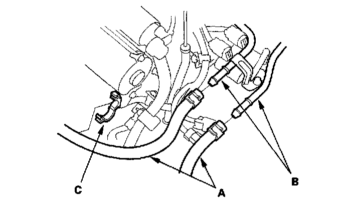 38. Connect the ATF cooler hoses (A) to the ATF cooler lines (B). Clamp the ATF cooler hose with the clamp (C) on the starter.