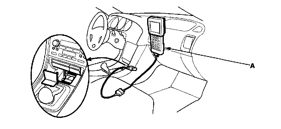 4. Connect the Honda PGM Tester (A), and go to the PGM-FI Data List; then go to step 7. If you don't have a PGM Tester, go to step 5.