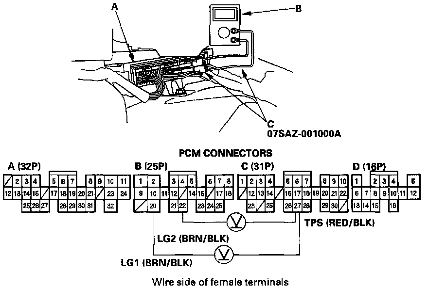 6. Connect a digital multimeter (B) and the special tools (C) to check voltage between the C27 (+) terminal and B20 (-) or B22 (+) terminal of the PCM.