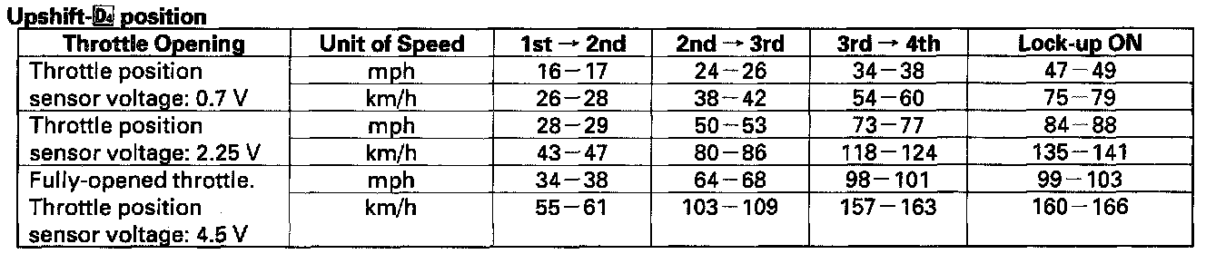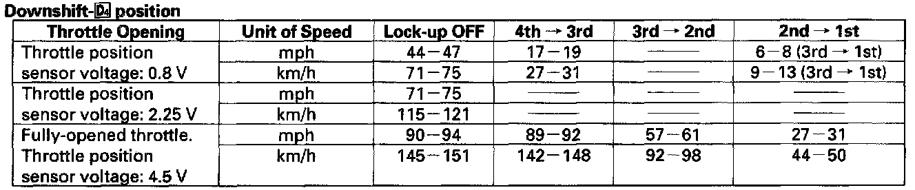 7. Test-drive the vehicle on a flat road in the [D4] position. Check for abnormal noise and clutch slippage. While driving, check that the shift points occur at the proper speeds by monitoring the throttle position sensor voltage and comparing your shift point speeds and voltage to those in the table. (The throttle position sensor voltage represents the throttle opening.)