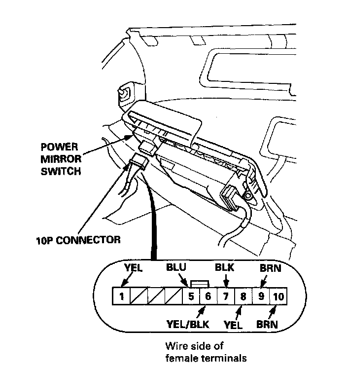 2. Disconnect the 10P and connector from the power mirror switch.