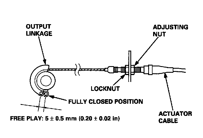 1. Check that the actuator cable moves smoothly with no binding or sticking.2. Measure the amount of movement of the output linkage until the engine speed starts to increase. At first, the output linkage should be located at the fully closed position. Free play should be 5 ± 0.5 mm (0.20 ± 0.02 in).