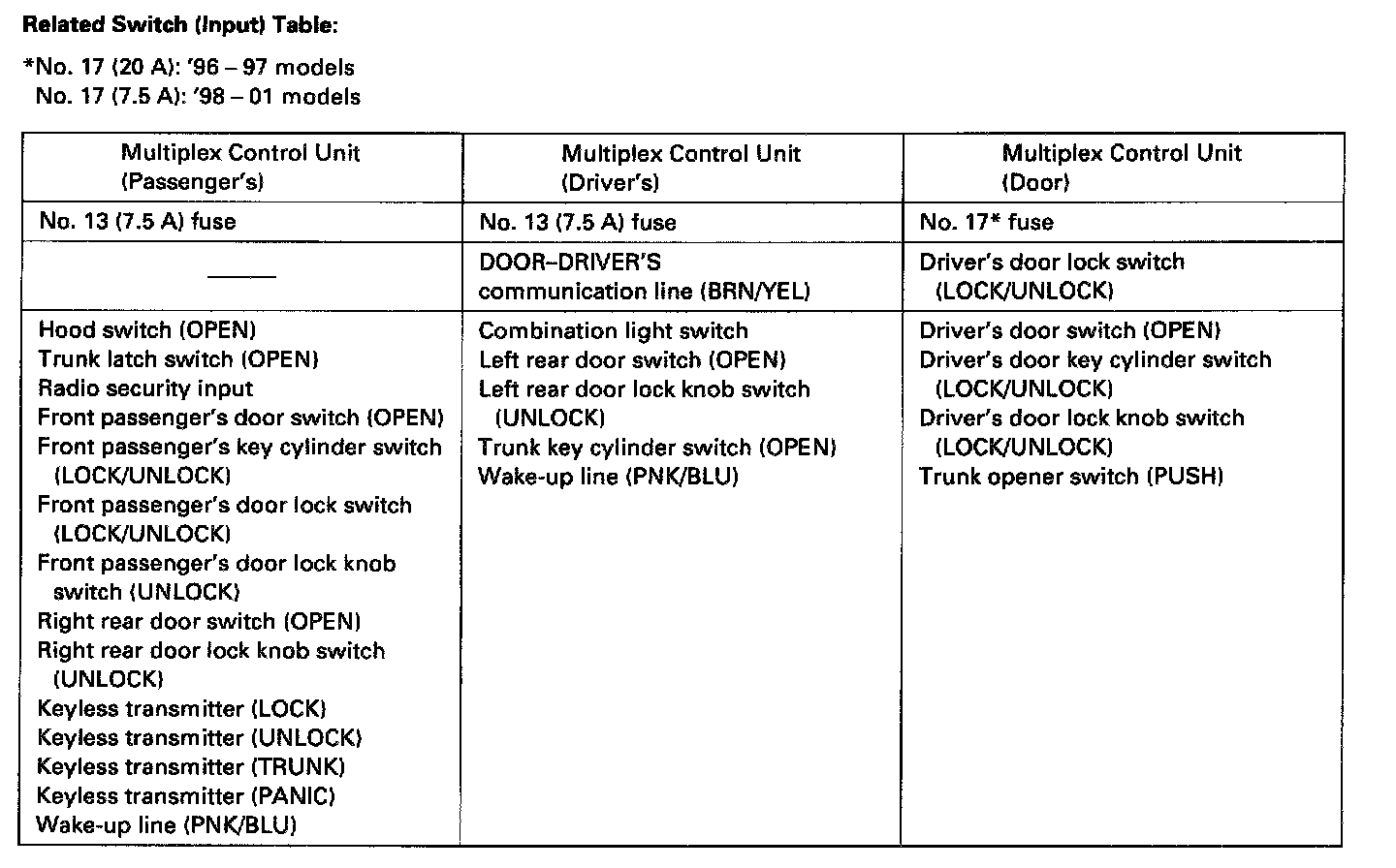 First, the door multiplex control unit wakes up, then the control unit starts to communicate to the driver's control unit. By this communication, the driver's control unit wakes up. The driver's control unit wakes the passenger's control unit up by the wake up line, and all the control units start to function.