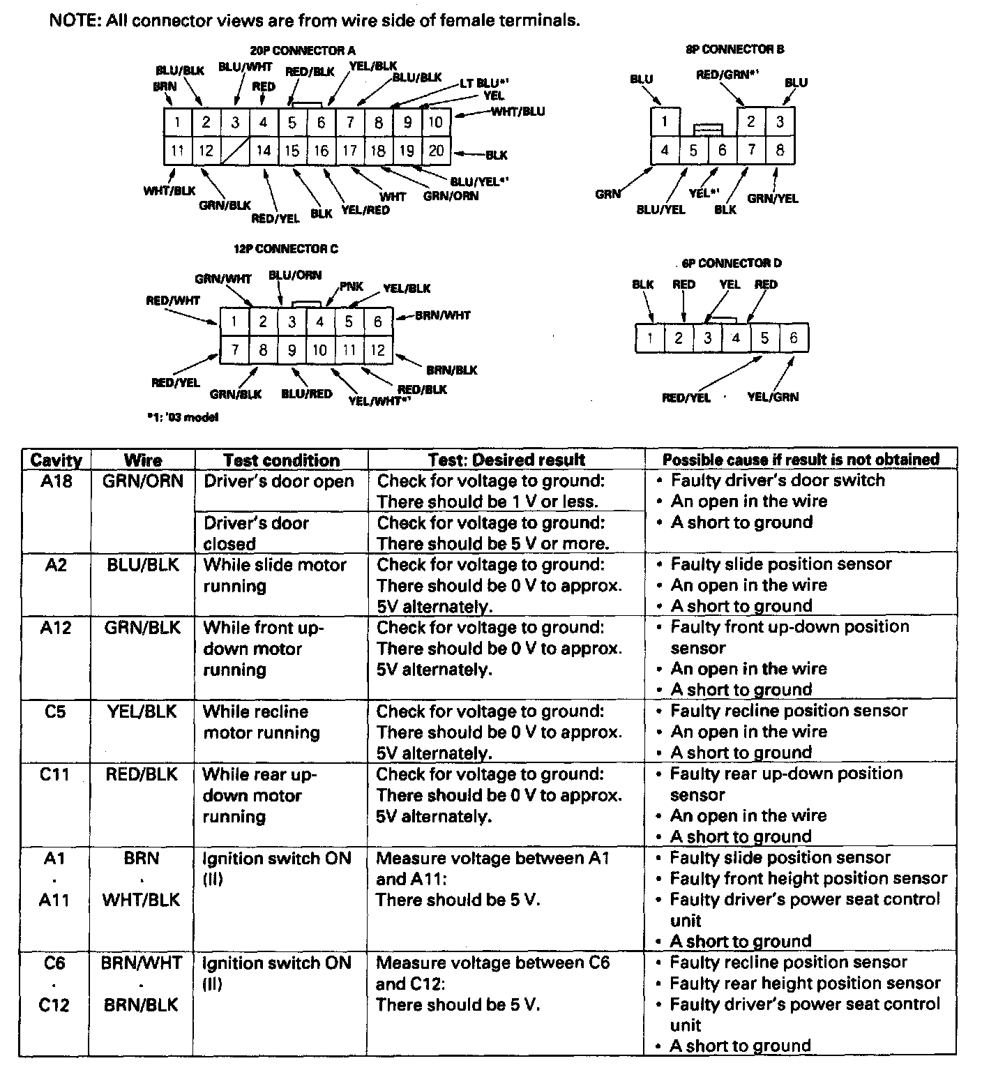 5. Reconnect the connectors to the driver's power seat control unit, and make these input tests at the connectors.