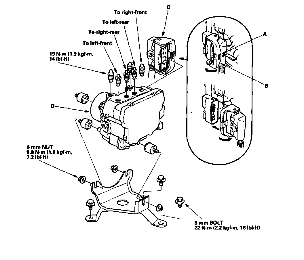 3. Disconnect the brake pipes, then remove the modulator unit (D).