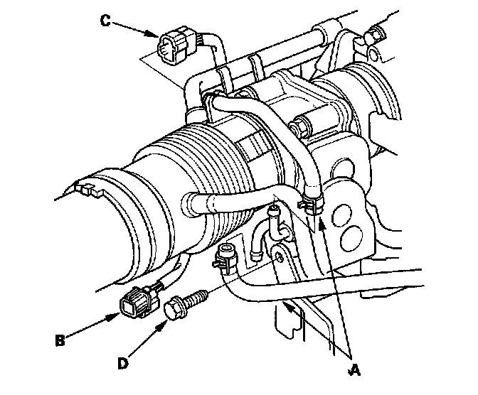 6. Remove the water bypass hoses (A). Disconnect the TCS control valve actuator connector (B) and the TCS control valve angle sensor connector (C) from the TCS control valve assembly, then remove the bolt (D) securing the TCS control valve bracket (J32A2 engine (A/T)).