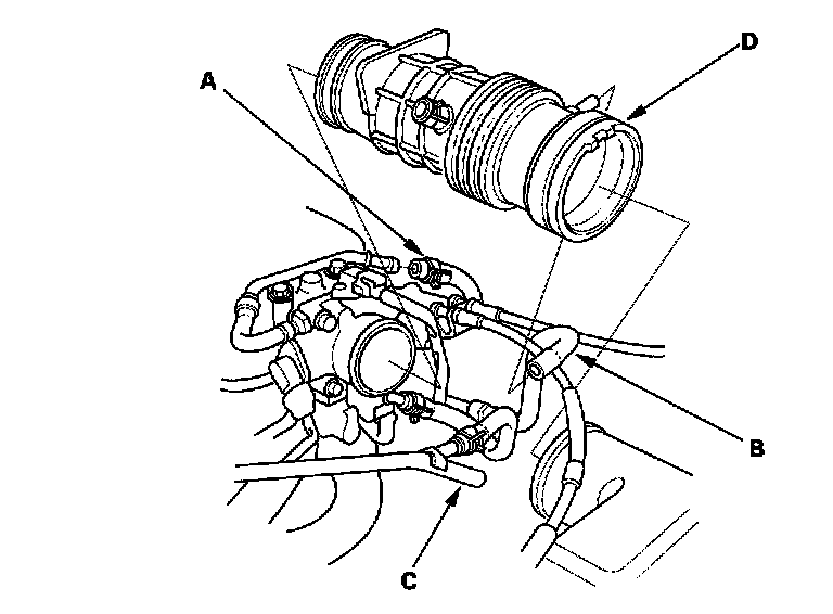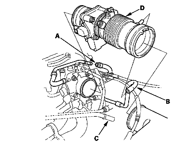 8. Remove the vacuum hose (B) and breather pipe (C), then remove the intake air duct (D).