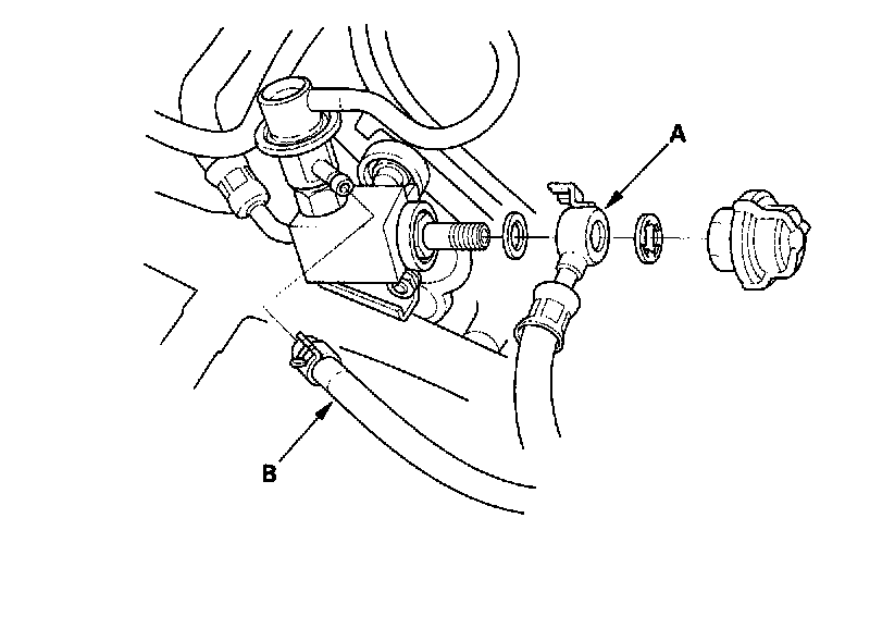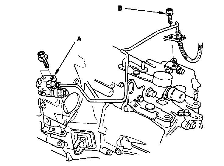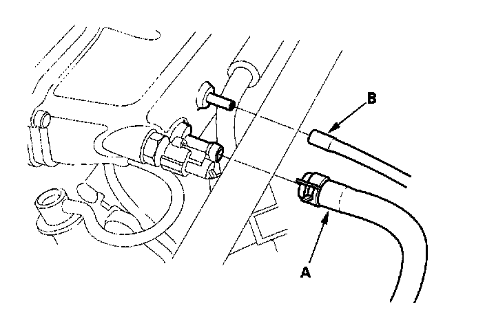 17. Remove the fuel feed hose (A) and fuel return hose (B).
