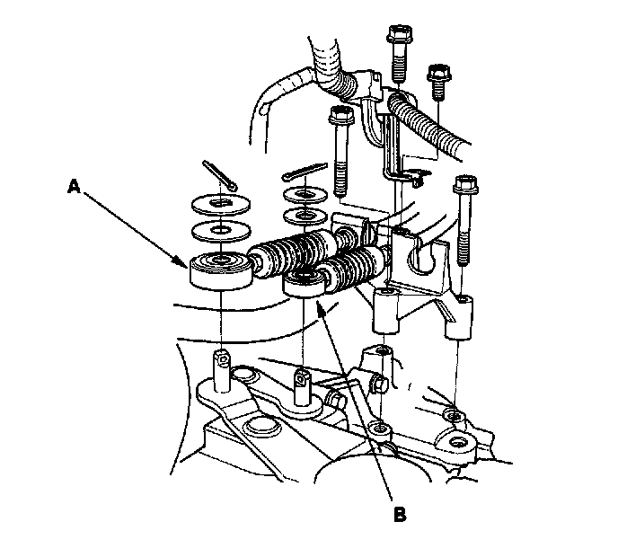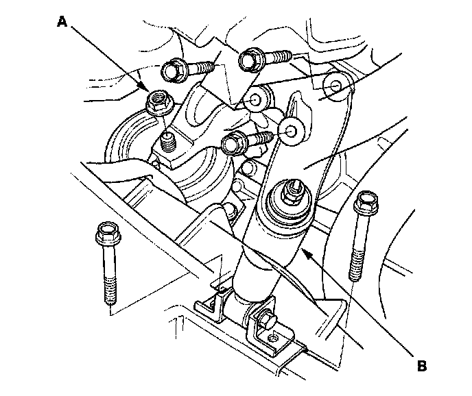 51. Remove the rear mount bracket support nut (A) and mounting bolt (B) (A/T).