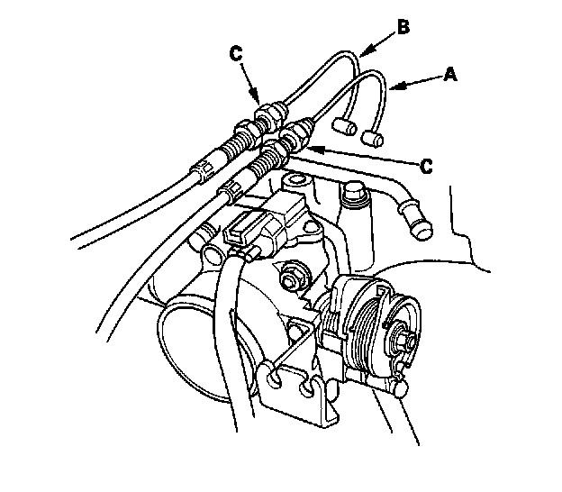 58. Disconnect the vacuum hose (A) on the front beam (B), and unlatch the P/S line clamps (C) on the front beam.