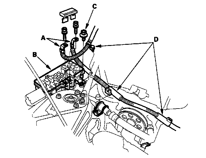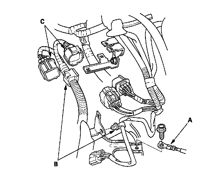 15. Remove the ground cable (A) and harness clamps (B), then disconnect the engine wire harness connectors (C) on the left side of the engine compartment.