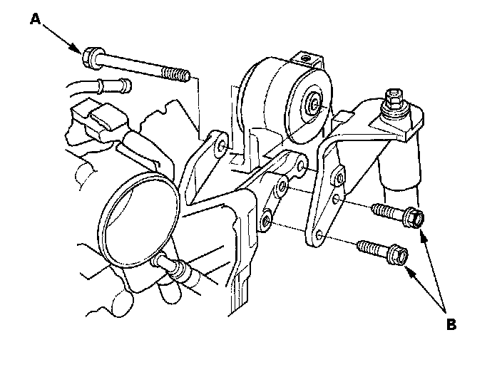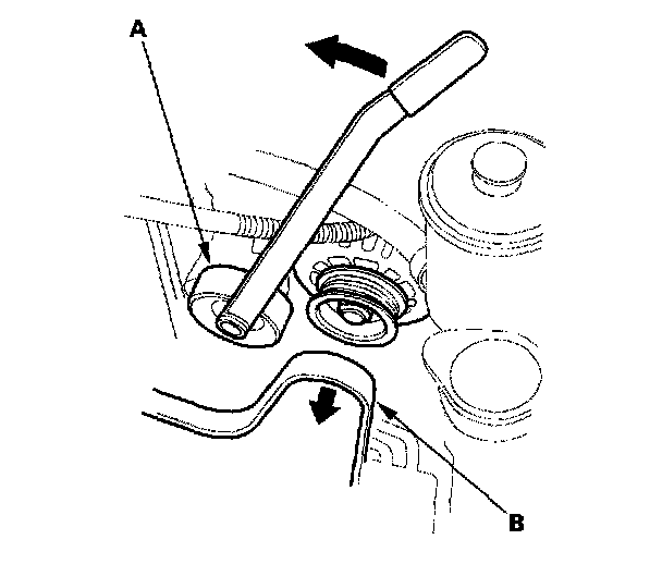 26. Move the auto-tensioner (A) to remove tension from the alternator belt (B), then remove the alternator belt.