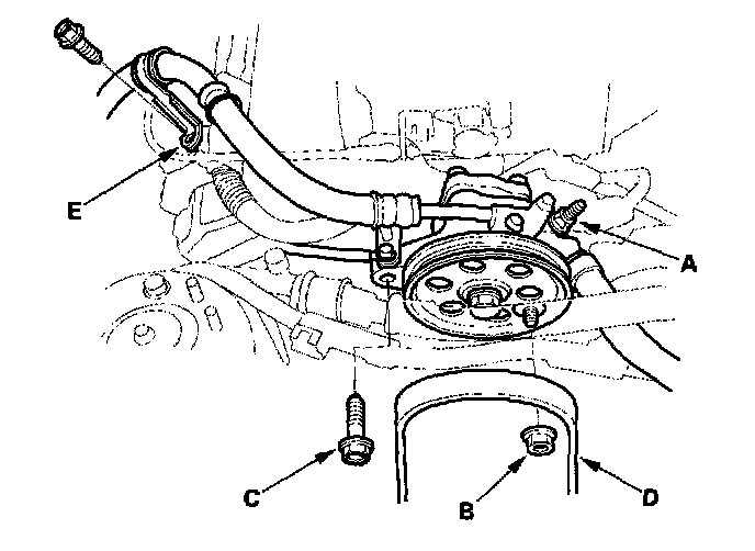 27. Loosen the adjusting nut (A), remove the locknut (B) and mounting bolt (C), then remove the Power Steering (P/S) pump belt (D) and pump without disconnecting the P/S hoses.