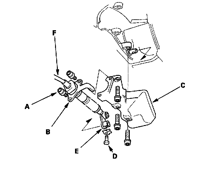 38. Remove the lock bolt (D) securing the control lever (E), then remove the shift cable (F) with the control lever. Take care not to bend the shift cable while removing it (A/T).