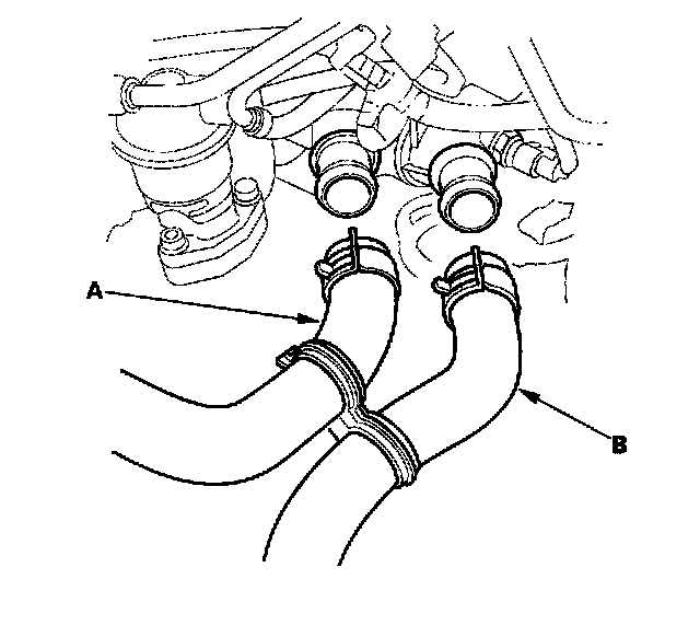 43. Remove the upper radiator hose (A) and lower radiator hose (B).