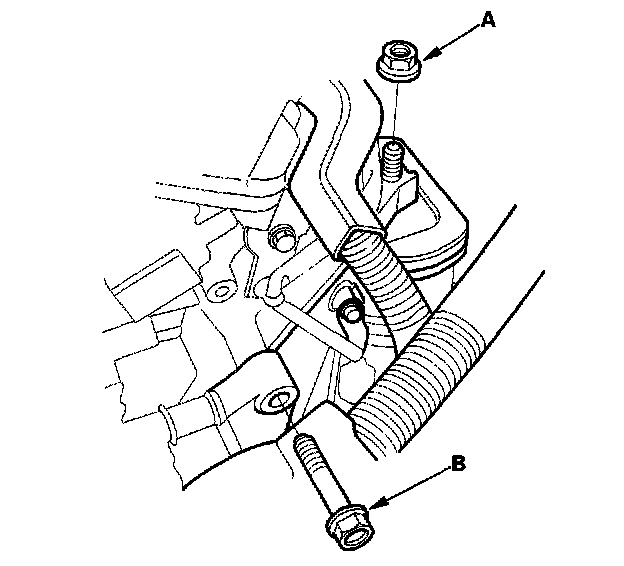 12. Remove the clutch slave cylinder (A) and clutch line bracket mounting bolt (B) (M/T).