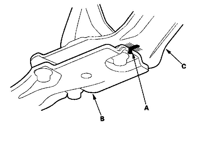 57. Make a reference mark (A) across the front beam (B) and the rear beam (C).