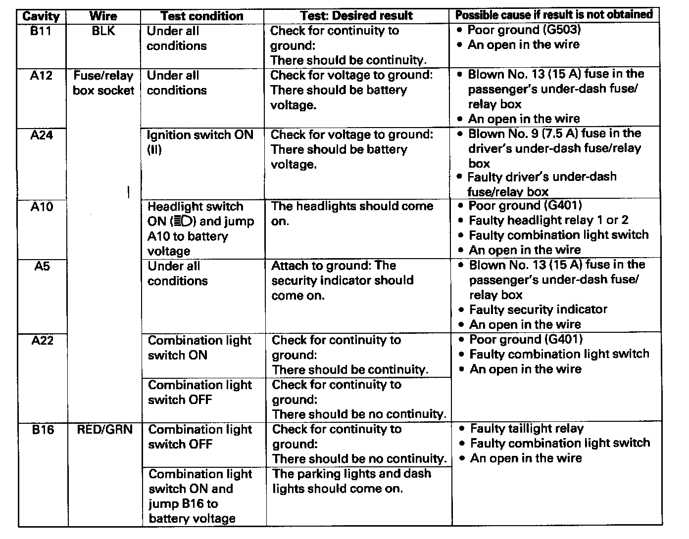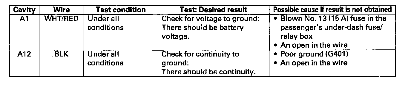 8. With the passenger's multiplex control unit still disconnected, make these input tests at the connectors and the passenger's under-dash fuse/relay box sockets.