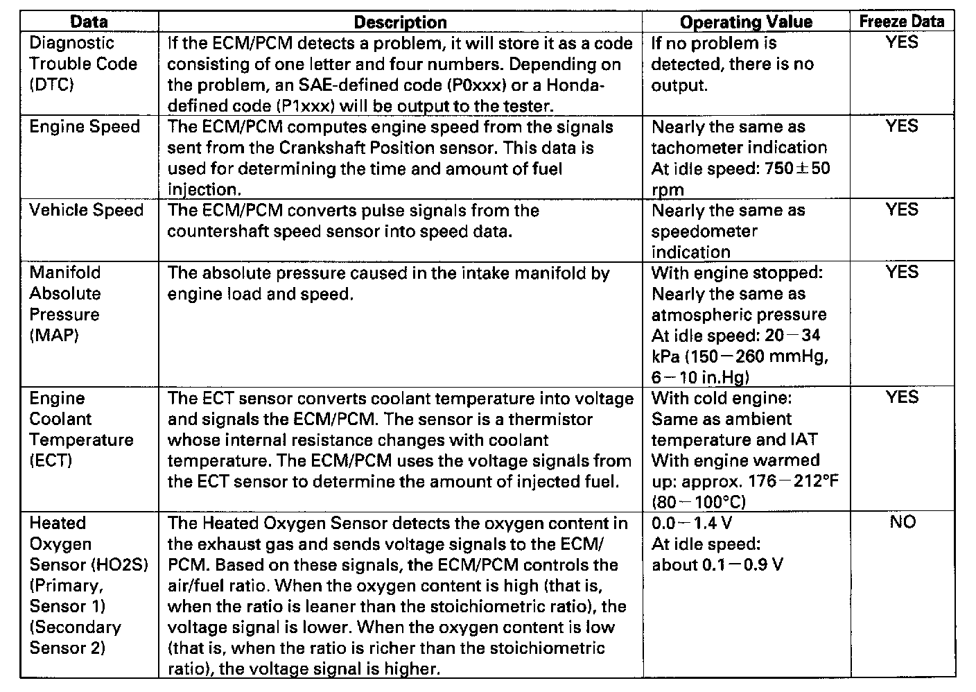ECM/PCM DataYou can retrieve data from the ECM/PCM by connecting the OBD II scan tool or the Honda PGM Tester to the Data Link Connector (DLC). The items listed in the table below conform to SAE recommended practice. The Honda PGM Tester also reads data beyond that recommended by SAE. Understanding this data may help you find the causes of intermittent problems.