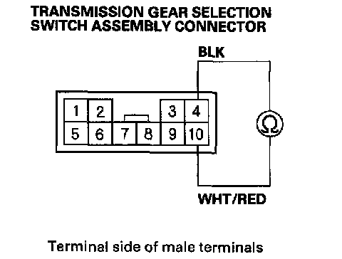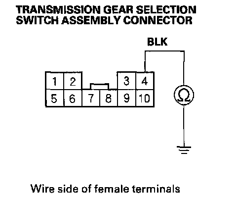 7. With the shift lever in Park and pushed to the right, check for continuity between the No. 4 and No. 10 terminals of the transmission gear selection switch assembly connector.