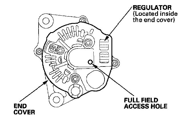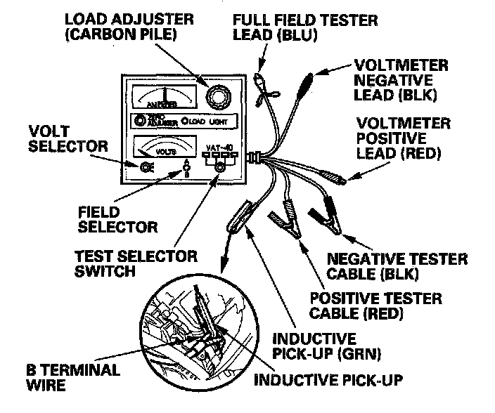 11. With the engine speed still at 2,000 rpm, full-field the alternator. Attach the probe to the VAT-40 full-field test lead, and insert the probe into the full field access hole at the back of the alternator. Switch the field selector to the "A (Ground)" position momentarily, and check the amperage reading. Because voltage will rise quickly when the alternator is full-fielded, do not allow the voltage to exceed 18 V: it may damage the electrical system.