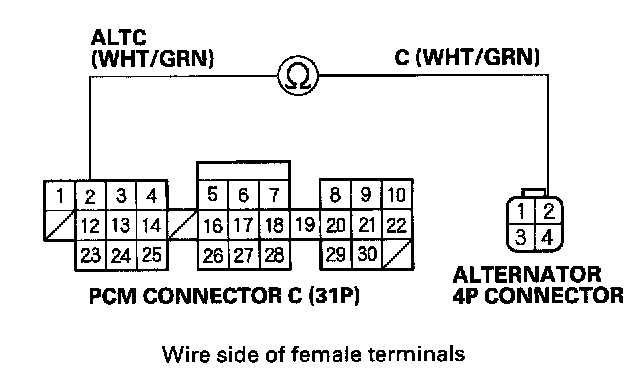 10. Check for continuity between the PCM connector terminal C2 and alternator 4P connector terminal No.2.