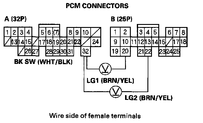 5. Press the brake pedal, and measure the voltage between PCM connector terminals A32 and B20 or B22.