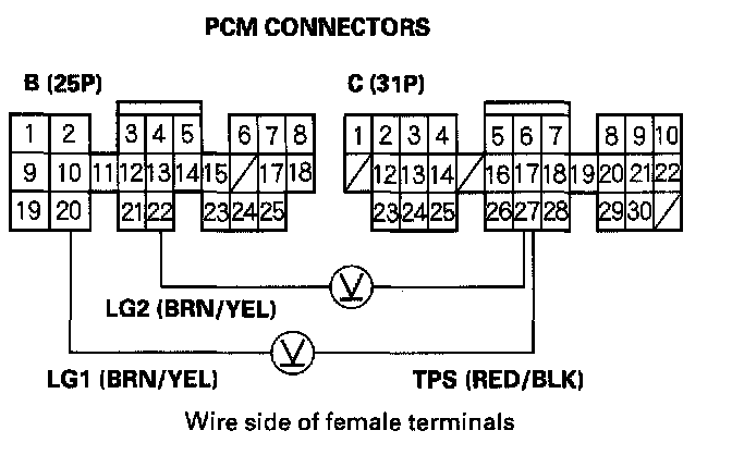 8. Measure the voltage between PCM connector terminals C27 and B20 or B22.
