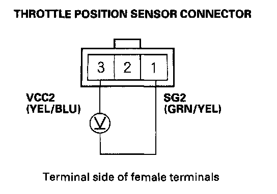 11. Measure the voltage between the No. 1 and No. 3 terminal of the throttle position sensor connector.