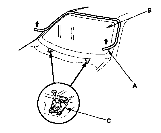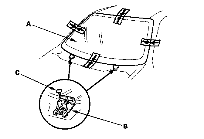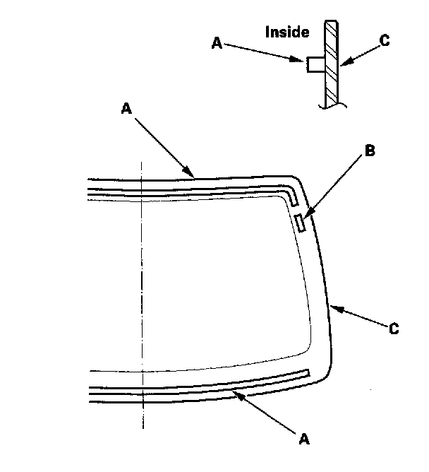 15. Glue the rubber dam (A), fastener (B), and other parts to the inside face of the glass (C), windshield, rear window, quarter glass. Be careful not to touch the glass where adhesive will be applied.