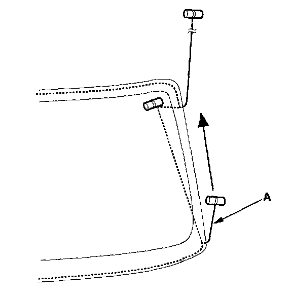 9. With a helper on the outside, pull the piano wire (A) back and forth in a sawing motion. Hold the piano wire as close to the glass as possible to prevent damage to the body and related parts. Carefully cut through the rubber dam and adhesive around the entire glass.
