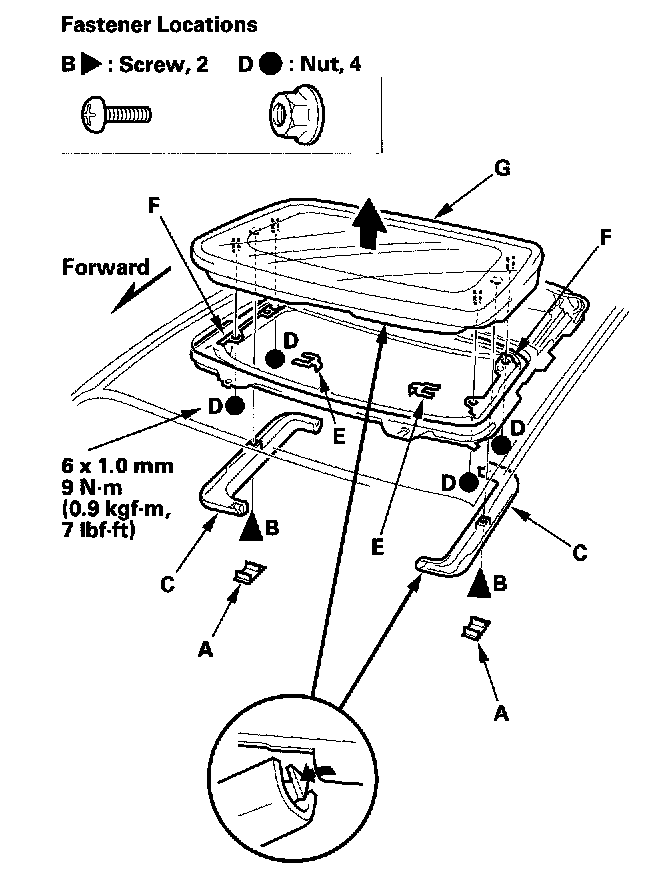 4. Remove the glass (G) by lifting it up. Do not damage the roof panel.