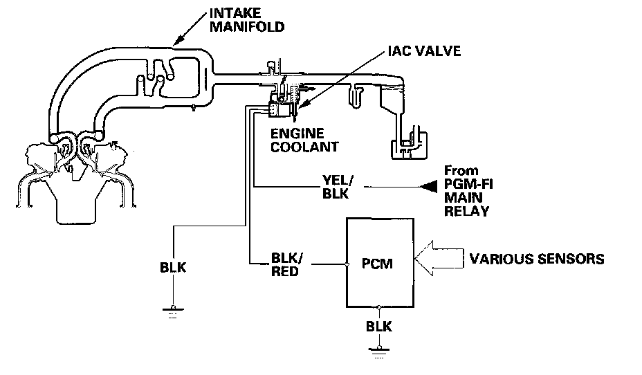 Idle Control System DiagramWhen the engine is cold, the A/C compressor is on, the transmission is in gear, the brake pedal is pressed, the P/S load is high, or the alternator is charging, the PCM controls current to the AC valve to maintain the correct idle speed. Refer to the System Diagram to see the functional layout of the system.