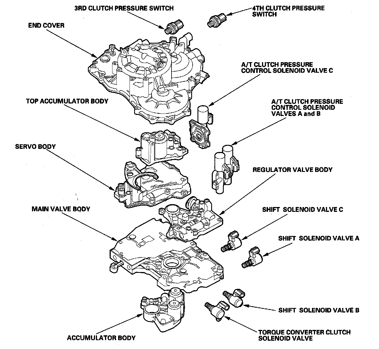 Hydraulic ControlsThe valve body includes the main valve body, the regulator valve body, the servo body and the accumulator body. The ATF pump is driven by splines on the left end of the torque converter which is attached to the engine. Fluid flows through the regulator valve to maintain specified pressure through the main valve body to the manual valve, directing pressure to each of the clutches. The shift solenoid valves B and C are mounted on the outside of the torque converter housing. The shift solenoid valve A and the torque converter clutch solenoid valve are mounted on the torque converter housing. The A/T clutch pressure control solenoid valves A, B. and C are mounted on the transmission housing.
