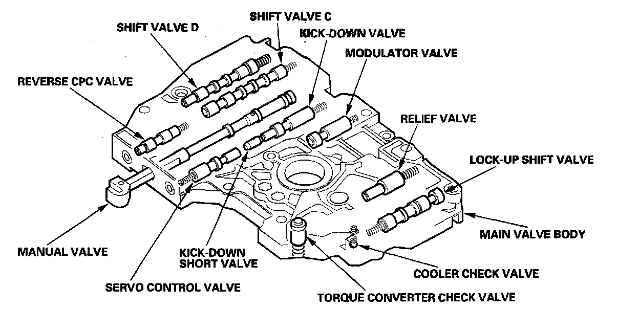 The main valve body contains the manual valve, the modulator valve, the shift valve C, the shift valve D, the servo control valve, the cooler check valve, the torque converter check valve, the reverse CPC valve, the lock-up shift valve, the relief valve, the kick-down valve, the kick-down short valve, and the ATF pump gears. The primary function of the main valve body is to switch fluid pressure on and off and to control hydraulic pressure going to the hydraulic control system.