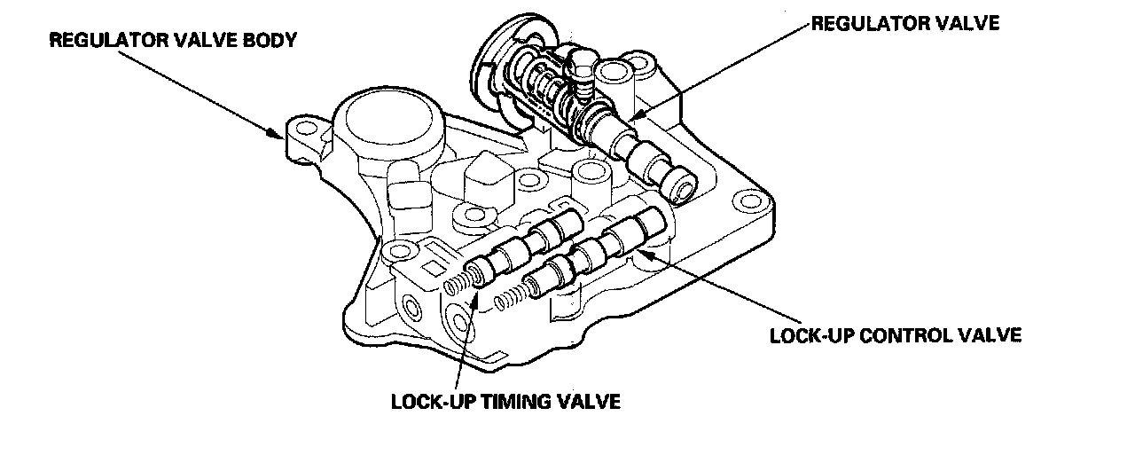 The regulator valve body is located on the main valve body. The regulator valve body contains the regulator valve, the lock-up timing valve, and the lock-up control valve.