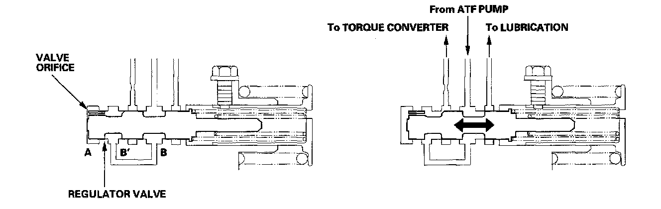 The regulator valve maintains constant hydraulic pressure from the ATF pump to the hydraulic control system, while also furnishing fluid to the lubricating system and torque converter. Fluid from the ATF pump flows through B and B'. Fluid entering from B flows through the valve orifice to the A cavity. This pressure of the A cavity pushes the regulator valve to the right side, and this movement of the regulator valve uncovers the fluid port to the torque converter and the relief valve. The fluid flows out to the torque converter and the relief valve, and the regulator valve moves to the left side. According to the level of the hydraulic pressure through B, the position of the regulator valve changes, and the amount of fluid from B' through torque converter changes. This operation is continued, maintaining the line pressure.