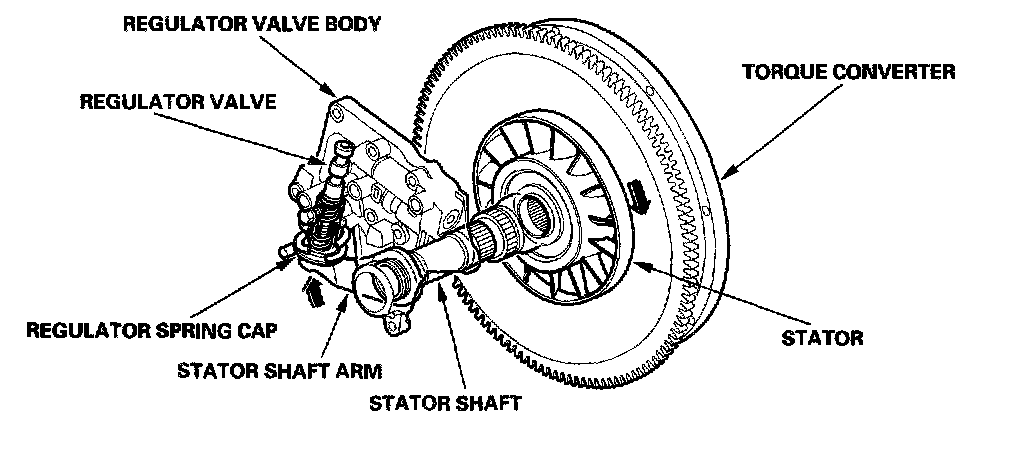 The stator shaft is spined to the stator in the torque converter, and its arm end contacts the regulator spring cap. When the vehicle is accelerating or climbing (torque converter range), stator torque reaction acts on the stator shaft, and the stator arm pushes the regulator spring cap in the direction of the arrow in proportion to the reaction. The stator reaction spring compresses, and the regulator valve moves to increase the line pressure which is regulated by the regulator valve. The line pressure reaches its maximum when the stator torque reaction reaches its maximum.