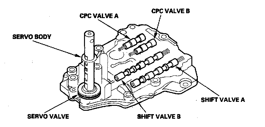 The servo body is on the main valve body. It contains the servo valve, the shift valve A, the shift valve B, CPC valves A and B.