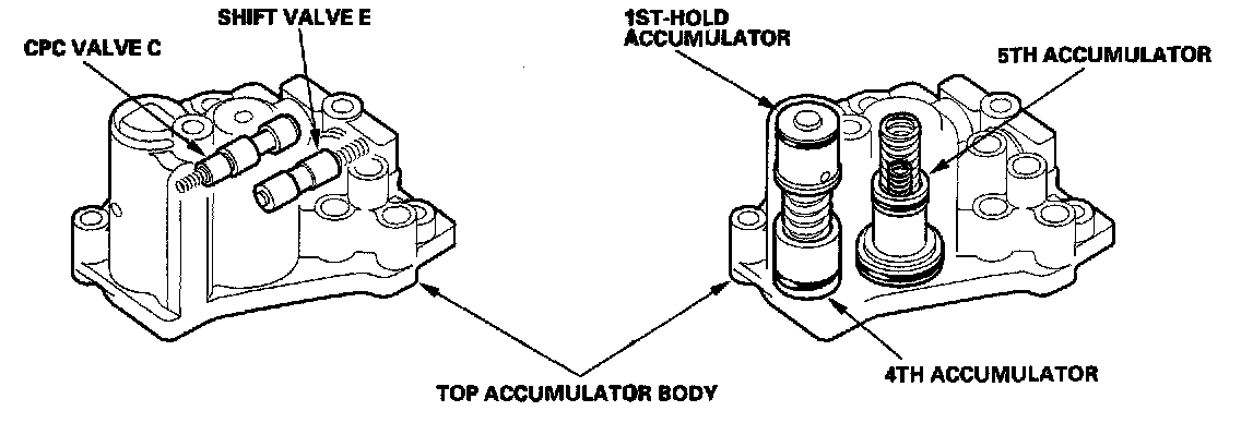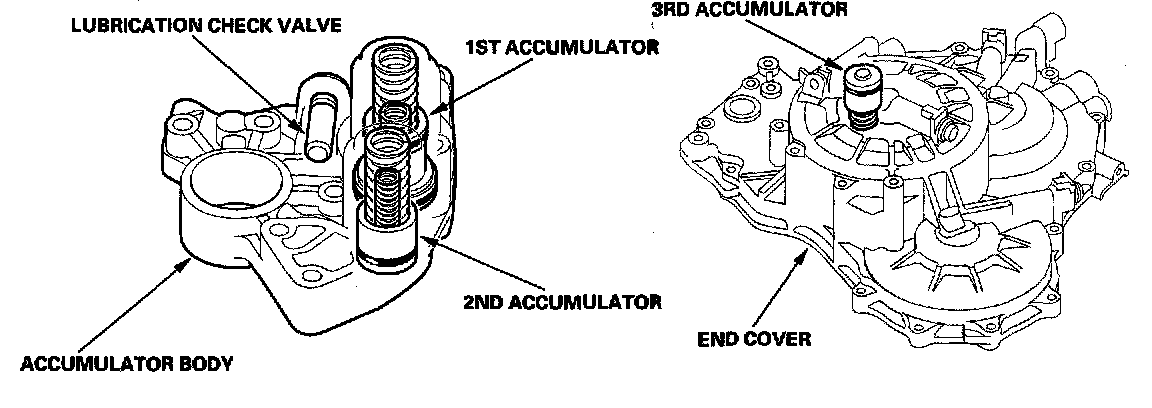 The accumulator body is on the torque converter housing, next to the main valve body. It contains the 1st and the 2nd accumulators and the lubrication check valve.