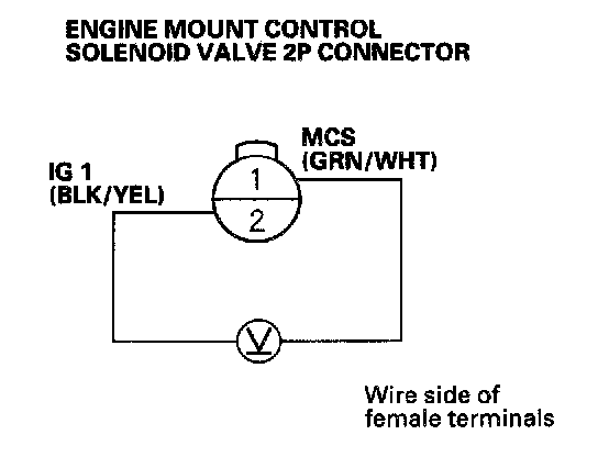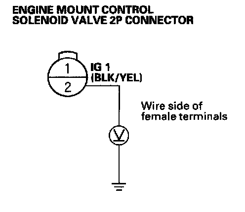 9. Measure voltage between the engine mount control solenoid valve 2P connector No.1 terminal and No.2 terminal.